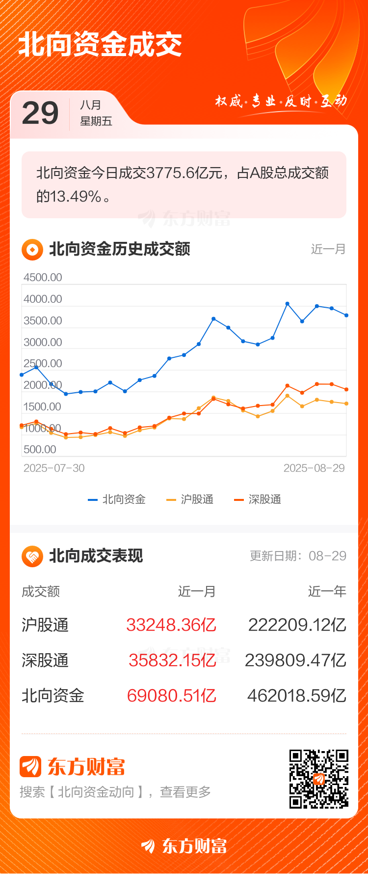 交易所最新数据显示,8月29日北向资金共成交3775.60亿元,占两市总成交额的13.49%。