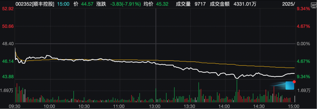 顺丰控股今日股价也出现大跌,盘中最大跌幅超9%。