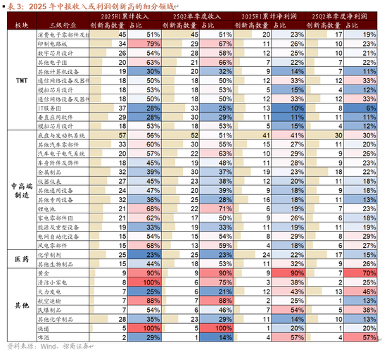此外,黄金(价格上涨)、清洁小家电(国补提振,内外销景气)、快递(网购渗透率提升、件量增长)、航空运输(客运修复、油价下行)等行业中收入创新高的个股占比较高;啤酒(成本红利)、民爆制品(爆破服务需求旺盛)、火力发电(成本下行)等行业中净利润创新高的个股占比较高。