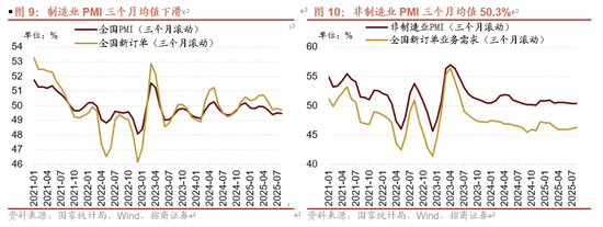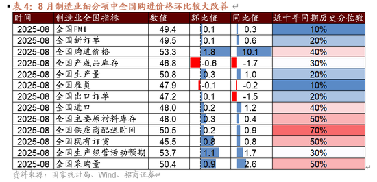 制造业PMI分项来看,反内卷背景下原材料价格上涨,生产经营活动预期改善,下游采购需求放量,共同支撑PMI回暖。生产端,生产指数50.8%,环比上行0.3个百分点;采购量指数环比上行0.9个百分点至50.4%、进口指数环比提升0.2个百分点至48.0%,价格止跌、预期改善带动生产端修复;需求端,新订单指数为49.5%,环比上行0.1个百分点,新出口订单指数47.2%,环比提升0.1个百分点,出口维持韧性增长,但需求整体仍处于收缩区间,且处于近十年同期较低水平,有待进一步修复。价格端,购进价格指数上升至53.3%,主要是煤炭、金属、钢铁、光伏等价格在反内卷政策提振、供给逐步优化的驱动下明显反弹。库存方面,产成品库存46.8%,环比下降0.6个百分点,主要原材料库存48.0%,环比提升0.3个百分点,主因企业经营预期改善,叠加原材料价格上涨,补库原材料备产需求较高。伴随“反内卷”的持续推进,价格有望止跌回暖,对制造业PMI继续形成支撑,但内需处于历史较低水平,有待进一步修复。