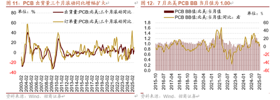 7月北美PCB出货量与订单量同比均由负转正。7月北美PCB出货量同比转正至20.70%(前值-8.60%),三个月滚动同比增幅扩大9.17个百分点至11.17%;PCB订单量同比转正至22.20%(前值-2.10%),三个月滚动同比增幅收窄0.43个百分点至9.87%。