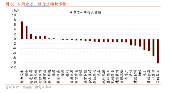 从行业上看,本周申万一级行业涨少跌多,电力设备(7.39%)、综合(5.38%)、有色金属(2.12%)等表现相对较好;非银金融(-4.96%)、计算机(-7.27%)、国防军工(-10.25%)等表现相对较差。从上涨原因看,本周表现较好的板块及主要原因:电力设备(部分细分赛道,如电池、储能等出现了基本面的边际改善)、有色金属(美联储降息预期明确);跌幅居前的行业原因,非银金融(指数大幅调整影响板块表现)、计算机(近期超涨明显,且多数标的均缺乏扎实的基本面支撑)、国防军工(前期涨幅过多)。