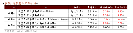 本周光伏产业链中硅料、硅片、组件价格上行。硅料方面,截至9月1日,国产多晶硅料价格和进口多晶硅料价格周环比上行2.31%至6.613美元/千克。硅片方面,截至8月27日,多晶硅片价格周环比上行10.34%至0.096美元/片。组件方面,截至8月27日,晶硅光伏组件价格周环比上行7.58%至0.071美元/瓦,薄膜光伏组件价格与上周持平为0.200美元/瓦。