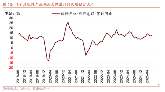 1-7月软件产业利润总额累计同比增幅扩大。1-7月软件产业利润总额累计同比上行12.40%,较1-6月累计同比增幅扩大0.40个百分点。