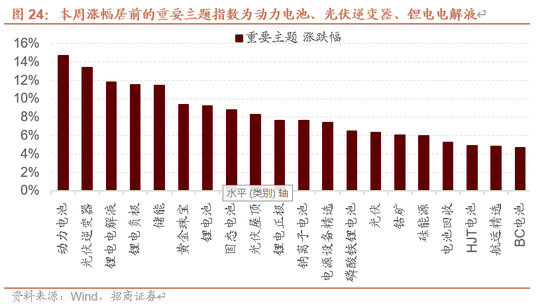 本周A股市场分化,万得全A下跌1.37%,沪深300下跌0.81%,创业板指上涨2.35%。A股涨幅居前的重要主题指数为动力电池、光伏逆变器、锂电电解液。