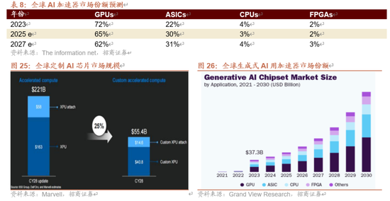 根据The information net的预测,2027年定制AI芯片(ASIC)将占到全球AI加速器市场份额的31%,比2023年增加近10%,而GPU将对应减少,从2023年的72%降到2027年的62%。Marvell AI预测,2028年全球定制AI芯片(ASIC)的市场份额将占到全球AI加速器市场份额的25%,同样对比2023年增加。根据Grand View Research预测,在全球生成式AI加速器领域,ASIC的份额会在2027-2028年占约三分之一。也就是说,研究机构普遍认为,GPU的相对份额减少,定制AI芯片份额提升,是未来的产业趋势所在。