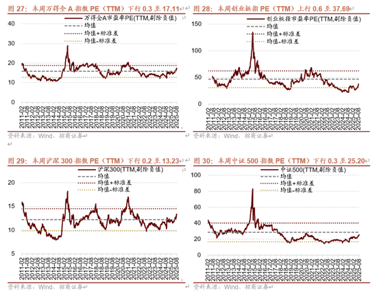 本周整体A股估值水平下行。截至9月5日收盘,万得全A指数PE(TTM)为17.11,处于历史估值水平(10年以来)的66.5%分位数。创业板指PE(TTM)上行0.6至37.69,处于历史估值水平的31.8%分位数。代表大盘股的沪深300指数PE(TTM)下行0.2至13.23,处于74.7%分位数。代表中小盘股的中证500指数PE(TTM)下行0.3至25.20,处于历史估值水平的46.8%分位数。